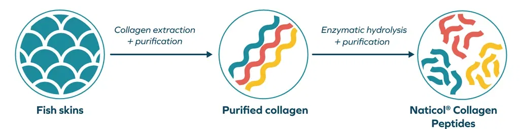 To obtain them, polypeptides chains are cut into pieces thanks to a process known as hydrolysis. As Naticol® collagen peptides are derived from fish skins, the process is carried out in two steps: